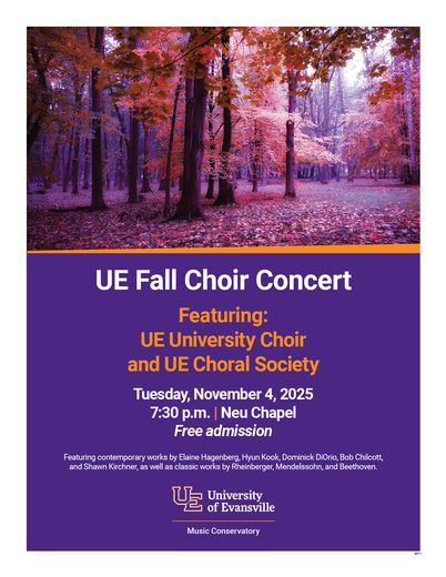 Join the talented singers of the UE University Choir and UE Choral Society for their Fall concert. The program will feature a wide variety of works, including contemporary works by acclaimed composer, Elaine Hagenberg, Korean composer Hyun Kook, and Indiana composer Dominick DiOrio. The program will also include classic works by Mendelssohn, Beethoven, and Rheinberger, as well as exciting arrangements of well-known melodies by Eric Nelson, Mack Wilberg, and Shawn Kirchner. |