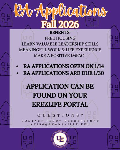 RA Applications open on January 14th and close on January 30th. To apply, please visit evansville.erezlife.com. Any questions can be directed to Teddy DeCorrevont (kt194@evansville.edu)