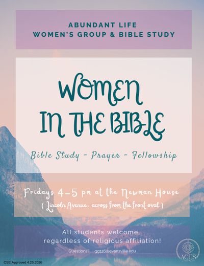 Join us for prayer, Bible study, and fellowship! This semester, the Abundant Life women's group will be reading about some of the great women in the Old and New Testaments. The group meets weekly from 4 to 5 pm on Fridays at the Newman house, but feel free to stop by as much or as little as you are able. All students are welcome, regardless of religious affiliation!