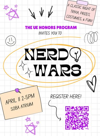 Calling all trivia nerds! Team sign-ups are now open for this year’s Nerd Wars trivia competition, happening Saturday, April 11, at 2:00 p.m. in the SOBA Atrium. The Honors Activity Board invites you to form a team of 3–5 competitors and battle it out in a competition of wits for prizes (LEGO set, JBL speaker, projector, Kindle Paperwhite, and MORE) and bragging rights. Teams can include students, faculty, administrators, and staff. Enjoy refreshments during the event, and don’t miss the costume contest; this year’s theme is Classic. Check the Honors Instagram @uehonors for more details. Registration is free, and individuals who don’t have a full team are still encouraged to sign up; we will assign you to a team on the day of. The registration deadline is April 9. Register online at: https://docs.google.com/forms/d/e/1FAIpQLSf5_kJ4yStXE8WiHM-0x_z224M9gctVFwd3EfmmNcHCcG-E-Q/viewform For questions, please contact ah779. |