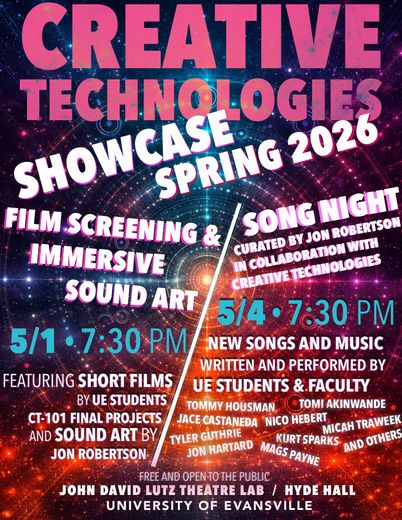 This concert will be held in the John David Lutz Theatre Lab in Hyde Hall, and will utilize the Immersive Audio Environment installed by Jon Robertson.